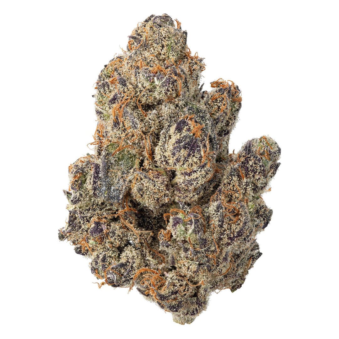 - Appearance: Vibrant purple-hued buds with deep green tones, orange pistils, and a frosty trichome layer